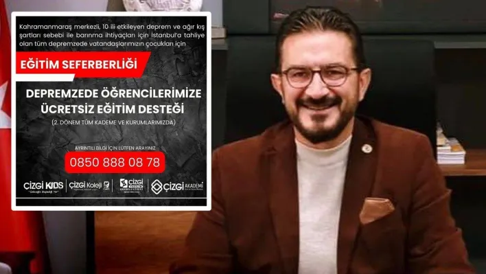 Çizgi Eğitim Kurumları kurucusu Ulaş Velioğlu, başlattıkları Eğitim seferberliği ile ilgili olarak “Kahramanmaraş merkezli ,10 ili etkileyen ve ağır kış şartları sebebiyle barınma ihtiyaçları için İstanbul’a tahliye olan tüm depremzede vatandaşlarımızın çocukları için 2.Dönemde tüm kurumlarımız ve tüm kademelerde ücretsiz eğitim desteği vereceğiz” dedi.