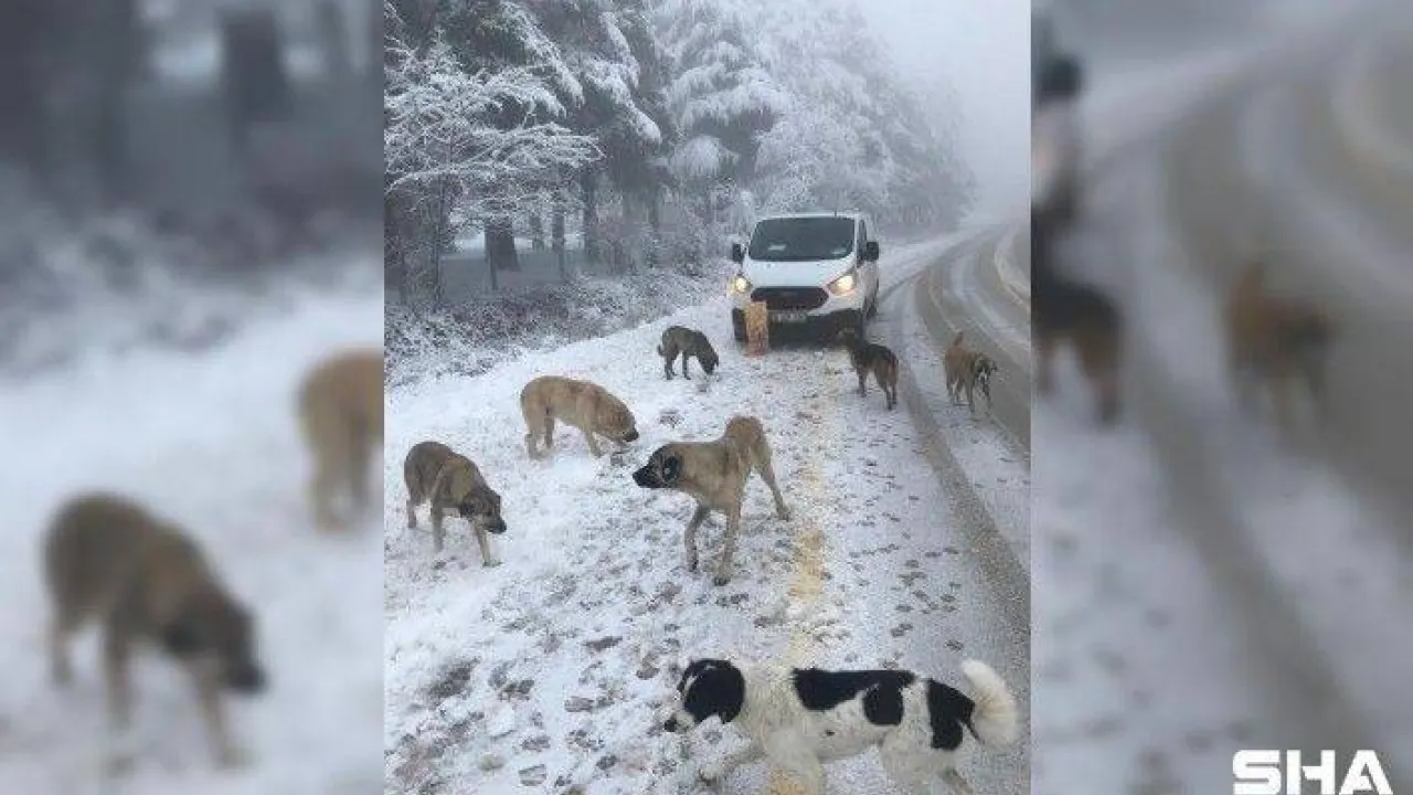 Osmangazi Belediyesi, Uludağ'daki sahipsiz hayvanların soğuk kış aylarında aç kalmaması için yol kenarlarına düzenli olarak kuru mama bırakıyor.