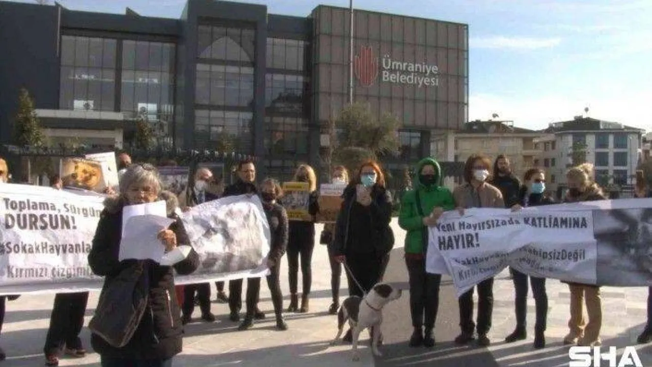 Ümraniye Belediye binası önünde toplanan hayvanseverler, sokak hayvanlarının korunmasına ve hayvanların sağlık işlemlerinin gerçekleştirilmesine yönelik sloganlar atarak basın açıklaması yaptı.