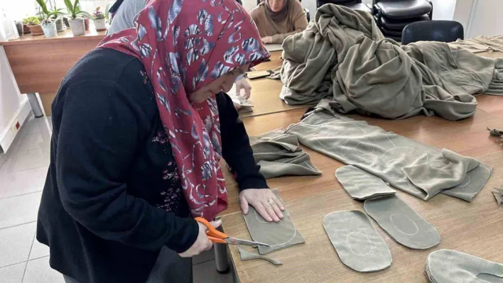 Ümraniye Belediyesi Kadın ve Aile Hizmetleri Müdürlüğü Meslek Edindirme Kursları'nda öğretmenlik yapan 25 kadın, depremzedeler için patik, eldiven, atkı, bere ve yelek dikiyor.