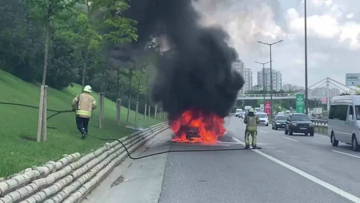 Ümraniye'de yolda ilerleyen bir otomobil alev alev yandı. İtfaiye ekipleri yangına müdahale ederek söndürdü. Yangın anları cep telefonu kamerasına yansıdı.