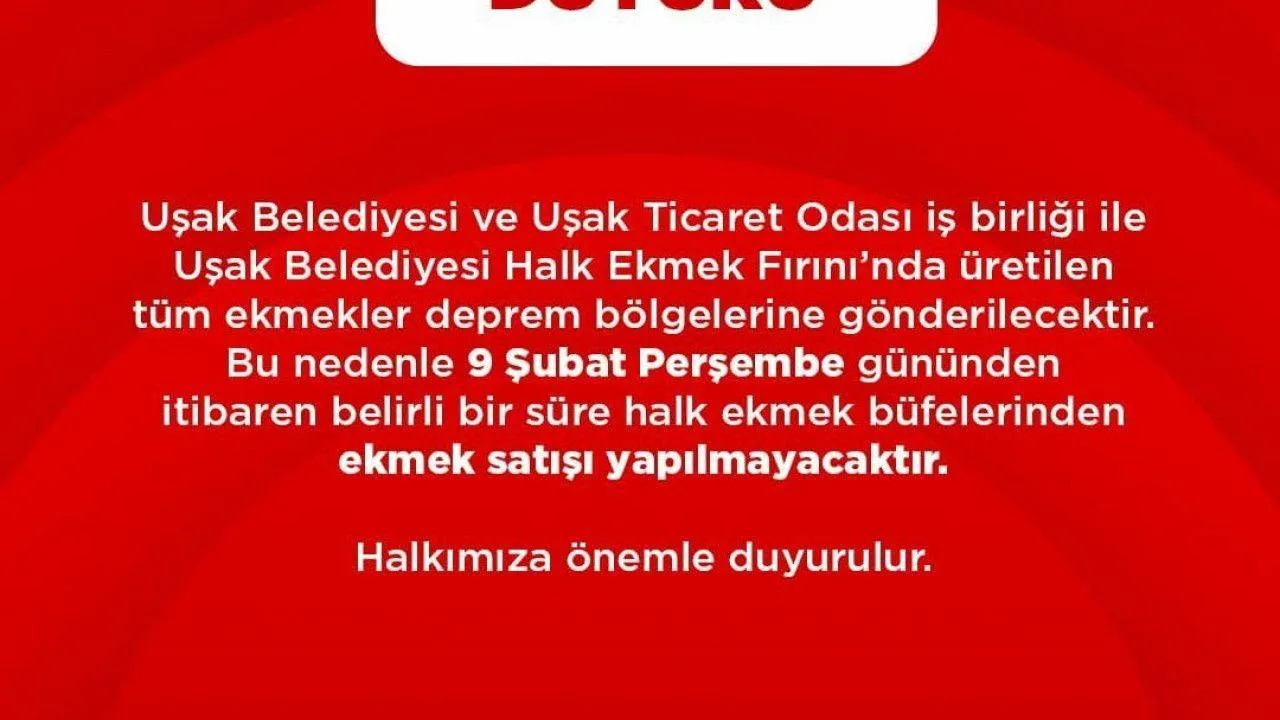 Uşak'ta 9 Şubat Perşembe günü itibariyle halk ekmek fırınlarında üretilen bütün ekmeklerin deprem bölgesine gönderileceği ve bu nedenle ekmek satışı yapılmayacağı duyuruldu.
