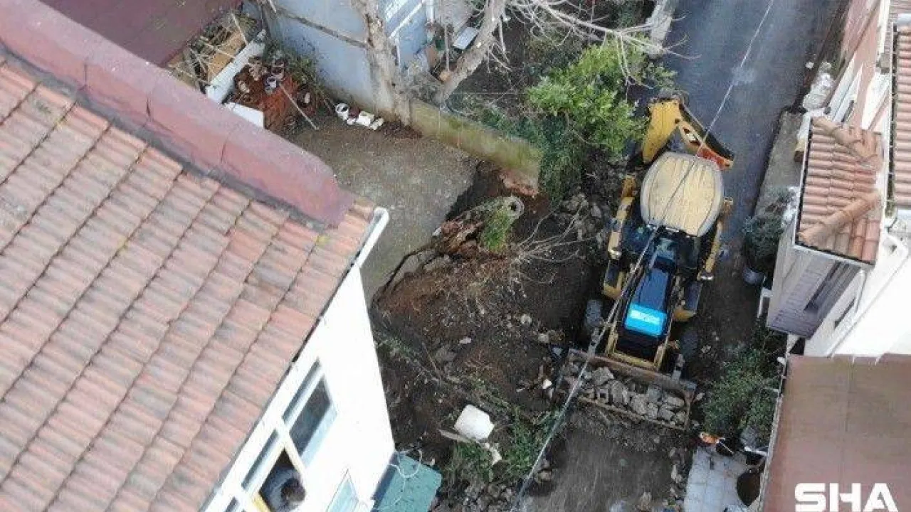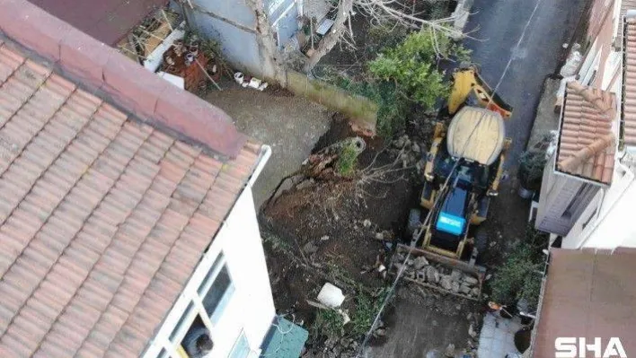 Üsküdar'da bir evin bahçesinde bulunan istinat duvarı, şiddetli yağmurun etkisiyle sabah saatlerinde çöktü. Olayda can kaybı yaşanmazken, yağmura dayanamayarak çöken istinat duvarı havadan görüntülendi.