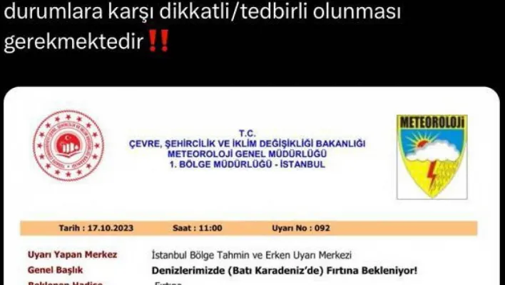 Sakarya Valiliği, meteorolojik verilere göre 18 Ekim Çarşamba günü sabah saatlerinden itibaren beklenen kuvvetli rüzgar ve fırtınaya karşı uyardı. Valiliğin sosyal medya hesabından yapılan paylaşımda, "İlimizin sahil kesimlerinde (Karasu, Kaynarca, Kocaali) yarın sabah saatlerinden itibaren şiddetli rüzgar (fırtına) beklenmektedir. Olumsuz hava koşullarında yaşanabilecek durumlara karşı dikkatli ve tedbirli olunması gerekmektedir" denildi.