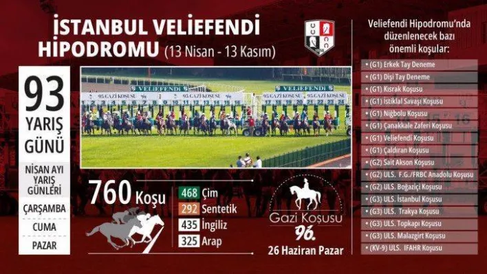 İstanbul Veliefendi Hipodromu’nda İlkbahar-Yaz yarış sezonunda 93 yarış gününde, 468’i çim ve 292’si sentetik olmak üzere toplamda 760 koşuda safkanlar birincilik için sahaya çıkacak. Bu koşuların 435’inde safkan İngiliz atları, 325’inde safkan Arap atları start alacak.