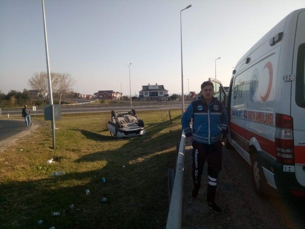 Kaza, akşam saatlerinde Sinekli Kavşağında meydana geldi. Edinilen bilgiye göre içerisinde iki kişinin bulunduğu özel otomobil sürücüsünün direksiyon hakimiyetini kaybetmesi sonucu virajı alamayarak takla attı.