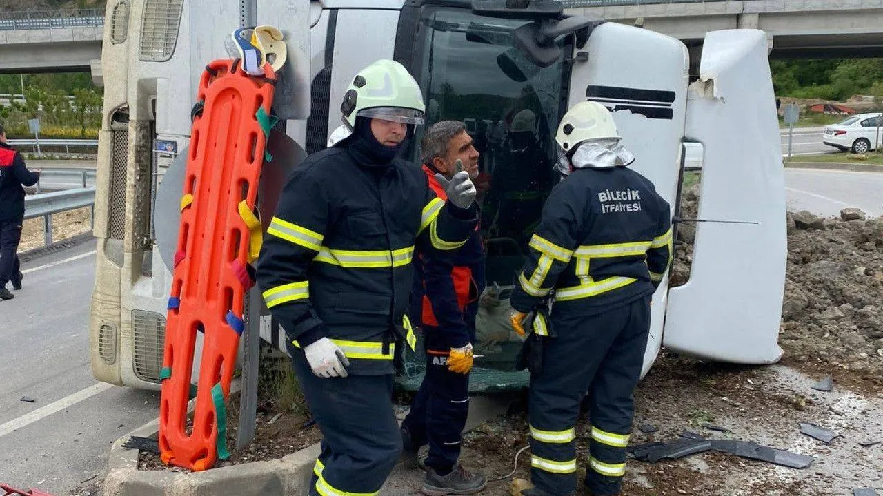 Alınan bilgilere göre; Bilecik’in Söğüt ilçesinden il merkezine seyir halindeki 11 TH 531 plakalı hafriyat yüklü kamyon sürücü B.Ü., köprülü kavşağa geldiğinde virajı alamayarak devrildi. Kazada araç içinde sıkışan sürücüyü Bilecik Belediyesine bağlı itfaiye ekipleri sıkıştığı yerden kurtararak, 112 ekiplerine teslim etti. Yaralı B.Ü., olay yerine gelen 112 Acil Servis ekiplerince yapılan ilk müdahalesinin ardından Bilecik Eğitim ve Araştırma Hastanesine kaldırıldı. Yaralının sağlık durumun iyi olduğu öğrenilirken polis kazayla ilgili inceleme başlattı.