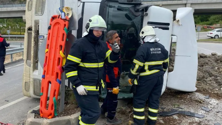 Bilecik'te virajı alamayan hafriyat yüklü kamyonun devrilmesi sonucu sürücü yaralandı.