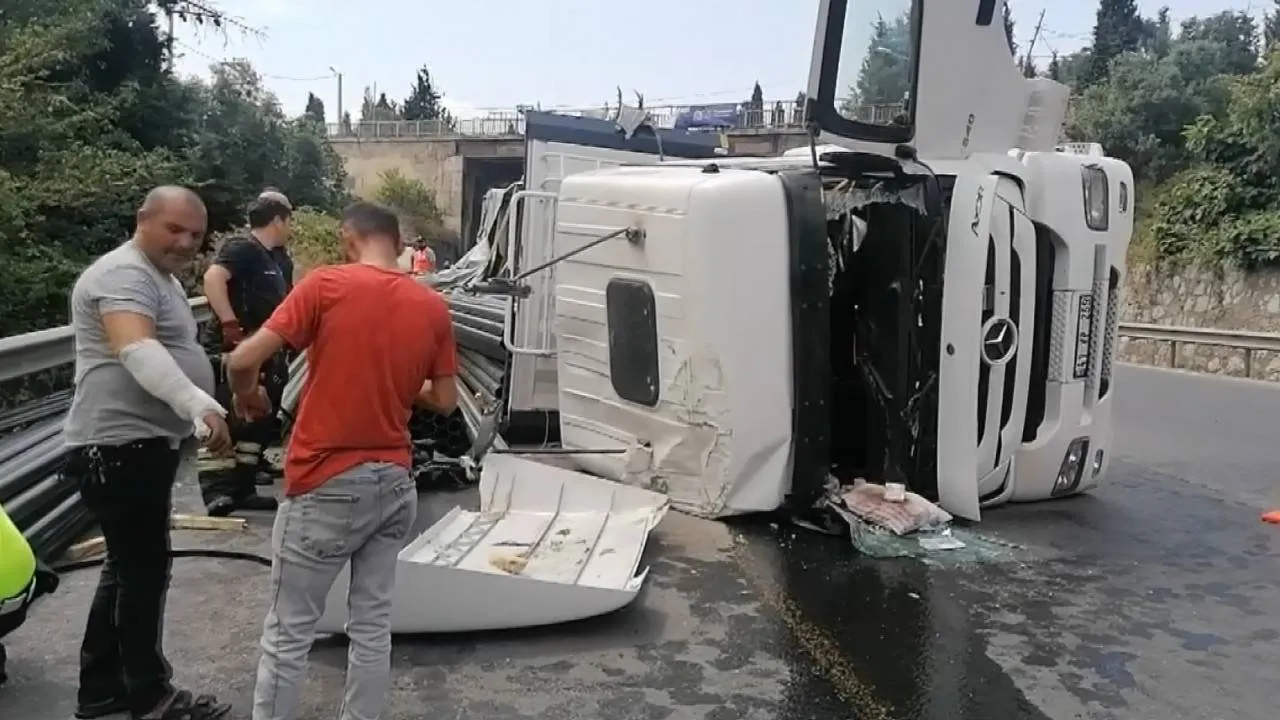 Virajı alamayan tır devrildi: Araçta sıkışan sürücü kazayı hafif sıyrıklarla atlattı