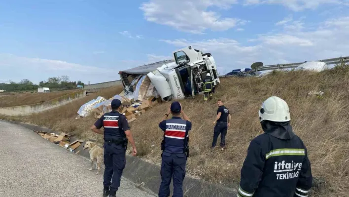 Tekirdağ’ın Ergene ilçesinde virajı alamayan tırın şarampole devrildiği kazayı şoför, yara almadan atlattı.
