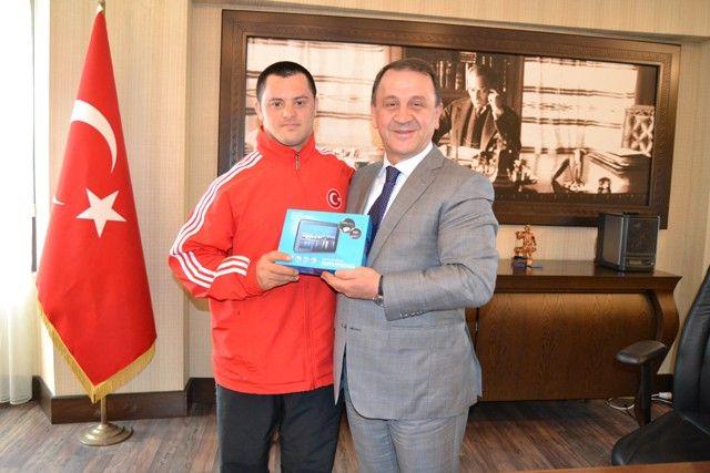 Başkan Işıklar, Türkiye Down Sendromlular Atletizm Şampiyonası’nda 200 metre ve 400 metre koşuda Türkiye şampiyonu, gülle atmada da ülke üçüncüsü olan Silivrili Volkan Yavuzaslan’a tablet hediye etti.