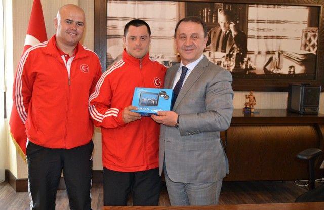 Başkan Işıklar, Türkiye Down Sendromlular Atletizm Şampiyonası'nda 200 metre ve 400 metre koşuda Türkiye şampiyonu, gülle atmada da ülke üçüncüsü olan Silivrili Volkan Yavuzaslan'a tablet hediye etti.