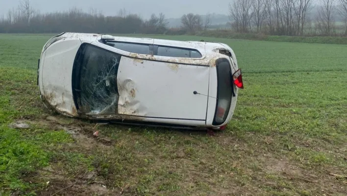 Yağışlı havada sürücüsünün kontrolünden çıkan otomobil tarlaya uçtu