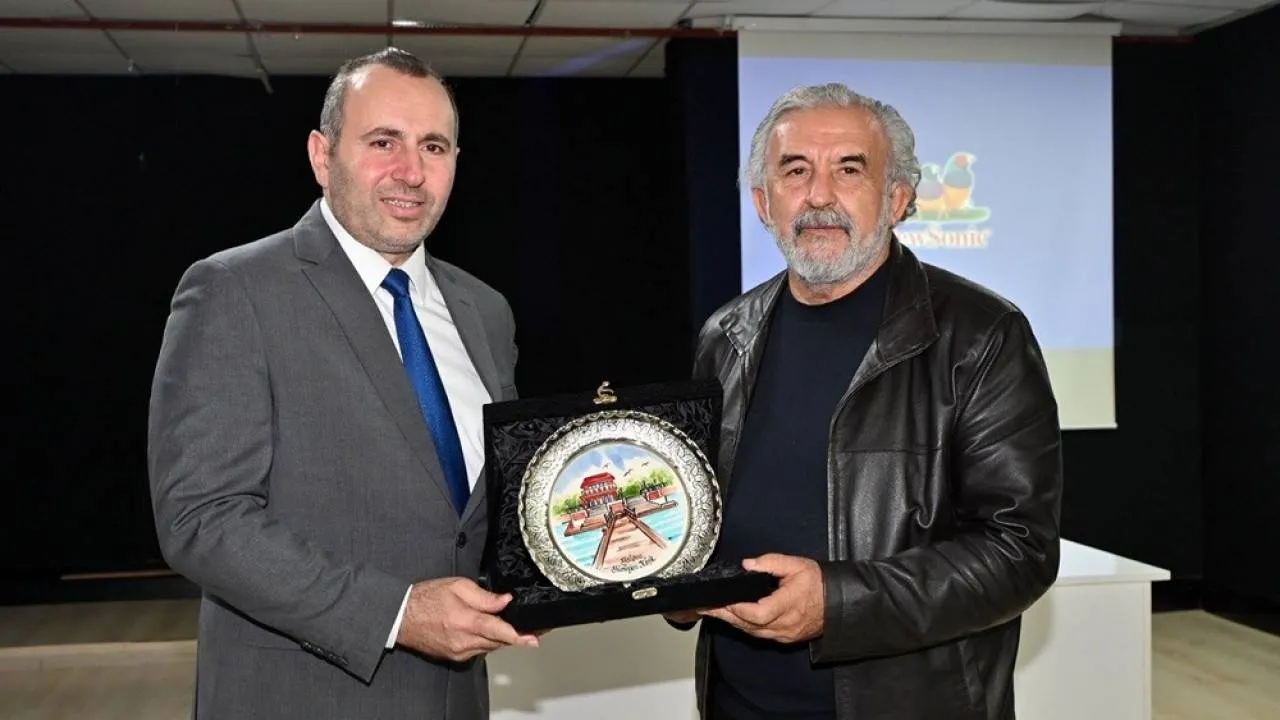 Söyleşi programı sonrası Ziraat Yüksek Mühendisi, Sosyal Girişimci, Düşünce Yönetmeni ve Çiftçi olan Tanfer Dinler’e teşekkür plaketi takdim eden Başkan Tutuk; “Gördüm ki öğrencilerimiz sizin ve diğer katılımcıların bilgileriyle geçtiğimiz günlerde ‘Su Ayak İziniz Kaç Numara’ isimli panelinde yapılan söyleşilerden feyz almışlar. Siz ve diğer katılımcılarımızın konuşmalarından etkilendiklerini, öğrendiklerini resimleyerek çok güzel eserler yansıtmışlar. Şimdi eserlerini bizlerle ve sanatseverlere sergileyerek sundular. Size de bugünkü söyleşi programınızdan dolayı teşekkür ediyor, şehrimizde ağırlamaktan dolayı mutluluk duyuyorum” dedi.