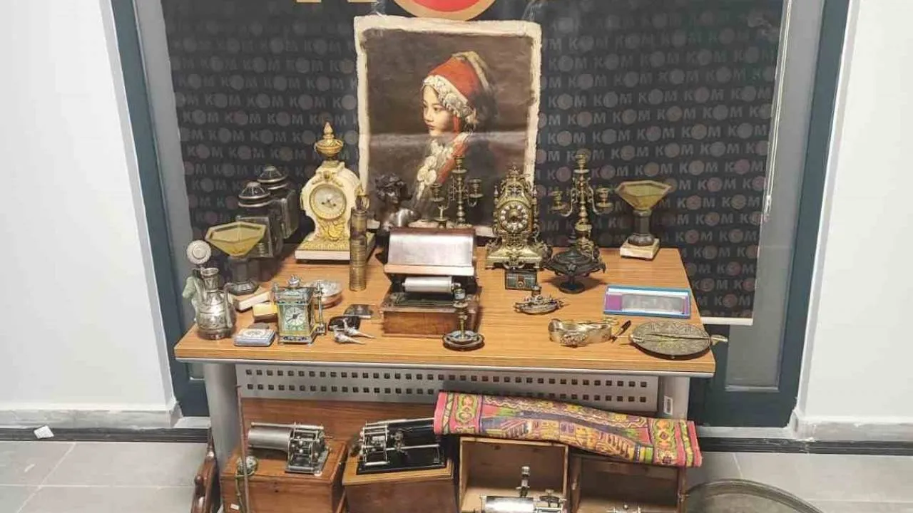 Alınan bilgiye göre, Kaçakçılık ve Organize Suçlarla Mücadele Şube Müdürlüğü ekipleri tarafından tarihi eser kaçakçılığı suçu ile ilgili olarak yapılan analiz çalışmaları çerçevesinde durdurulan araçta arama yapıldı. Aramada Osmanlı dönemine ait tarihi ve müzayede eser niteliğinde, mermer şömine saati, bronz şömine saati, 4 bronz şamdan, bronz kadın heykeli, Çin mineli şömine saati, 3 parça pirinç ibrik, 2 fayton feneri, bronz şekerlik, gümüş gelin kemeri, gümüş sigara tabakası, 4 parça mineli hokka takımı, 2 adet gümüş Kur’an-ı Kerim kabı, kaplumbağa kabuğundan yapılmış sigara tabakası, gümüş mineli sigara tabakası, savatlı tabir edilen sigara tabakası, kağıttan yapılmış papya maşa tabaka, at figürlü yeşil renkli biblo, 5 parçadan oluşan pirinç tabak, kılıç, kalem, maşa, 2 adet tavus kuşu biblo, gümüş renkli tas, kadın figürlü yağlı boya kadın portresi, el dokuma kilim, 3 adet gümüş taşlı yüzük, köpek figürlü obje, 5 adet fonograf (taş plak), 2 adet demir okkalı terazi, çan, 2 adet at üzengisi, 20 adet bakır tabak, tas ve tepsi ele geçirildi.