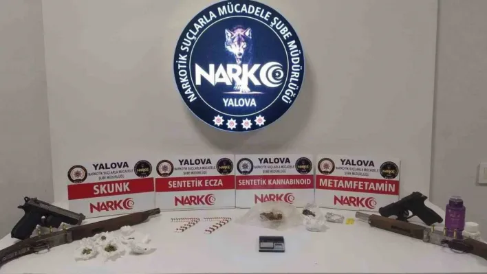 Alınan bilgiye göre, Yalova İl Emniyet Müdürlüğü Narkotik Suçlarla Mücadele Şubesi ekipleri, E.G’nin iş yeri ve yakın bölgesinde uyuşturucu ticareti yaptığı bilgisine ulaştı. Yapılan operasyonda E.G., F.A. ve E.K. gözaltına alındı. Şüphelinin iş yerinde yapılan aramada 59 sentetik ecza tablet hap, 17,51 gram sentetik kannabinoid, 6,50 gram skunk, 185 gram çözücü kimyasal madde, hassas terazi, 2 adet yarı otomatik av tüfeği, tabanca, 6 tabanca fişeği ve kuru sıkı tabanca ele geçirildi. E.G. emniyetteki işlemlerinin ardından sevk edildiği mahkemece tutuklanarak cezaevine gönderilirken, diğer 2 şüpheli hakkında ise kullanmak için uyuşturucu madde satın almak suçundan işlem yapıldı.