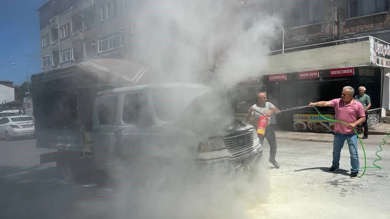Merkez Mahalle’de meydana gelen olayda, seyir halinde olan kamyonetin motor kısmında henüz belirlenemeyen sebepten dolayı yangın çıktı. Çevredeki vatandaşlar, yangın tüpü ile ilk müdahaleyi gerçekleştirerek alevlerin daha da büyümesini önledi. Durumun haber verilmesi üzerine bölgeye itfaiye ekipleri sevk edildi. Olay yerine ulaşan itfaiye ekipleri soğutma çalışması yaparken, konuya ilişkin inceleme başlatıldı.