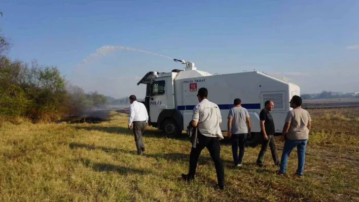 Edirne'de rüzgarın etkisiyle geniş alana yayılan anız yangına itfaiye ve orman işletme müdürlüğü ekiplerinin yanı sıra emniyete ait Toplumsal Olaylara Müdahale Aracı (TOMA) ile müdahale edildi.