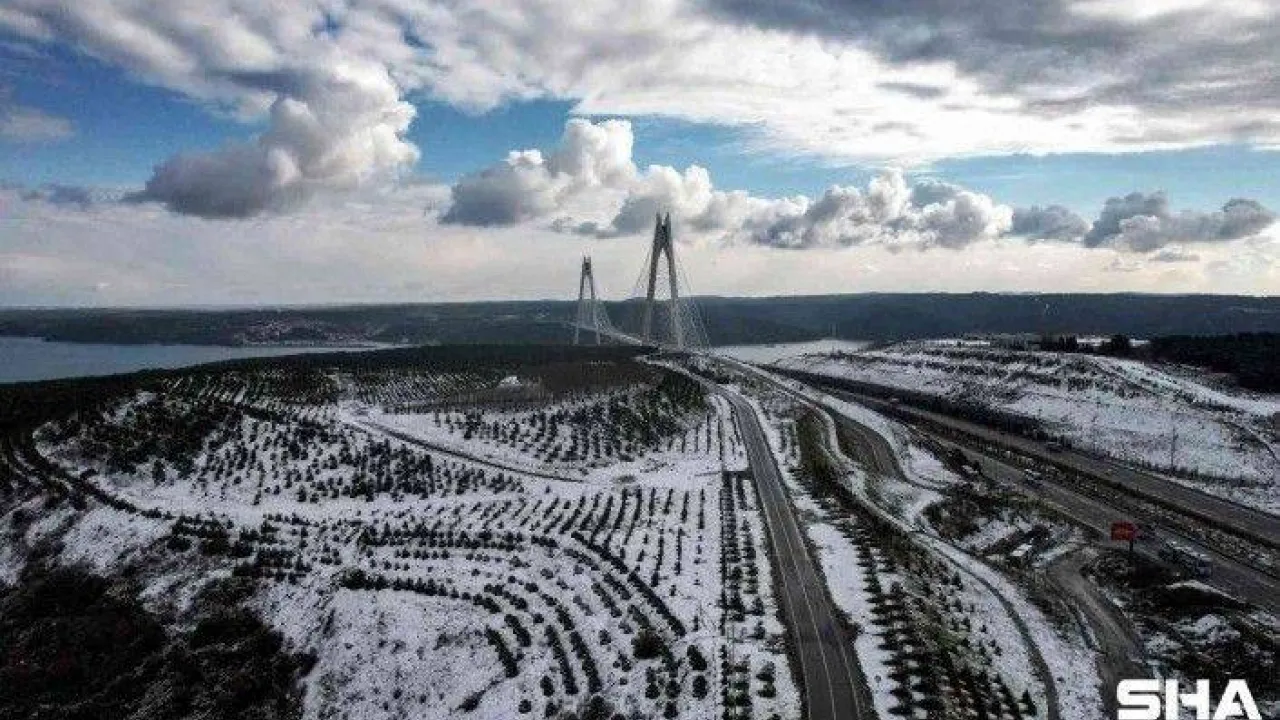 İstanbul'da etkili olan kar yağışının ardından beyaza bürünen Yavuz Sultan Selim Köprüsü'nün çevresi havadan görüntülendi.