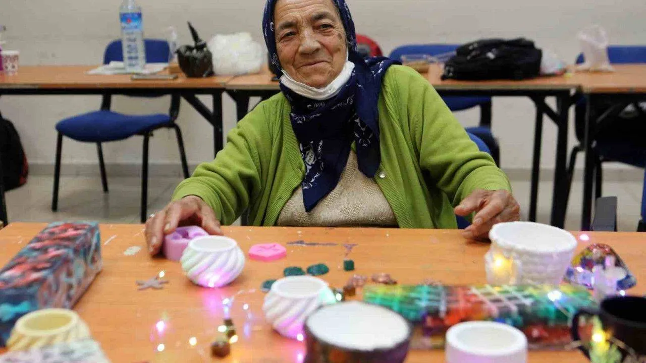 YENİMEK Meydan Kurs Merkezi’nde öğrenme azmi ve hevesiyle gençlerin gıpta ettiği Hediye Teyze, el yapımı sabun ve jel mum yapımı kursunda eğitim alıyor. Kurs merkezinde yeni insanlarla tanışıp sohbet ettiğini ve yeni beceriler kazandığını belirten Hediye Dağdelen, “Her zaman öğrenmeye hevesliydim. Kurs merkezi sayesinde yeni arkadaşlıklar ve dostluklar edindim” dedi.