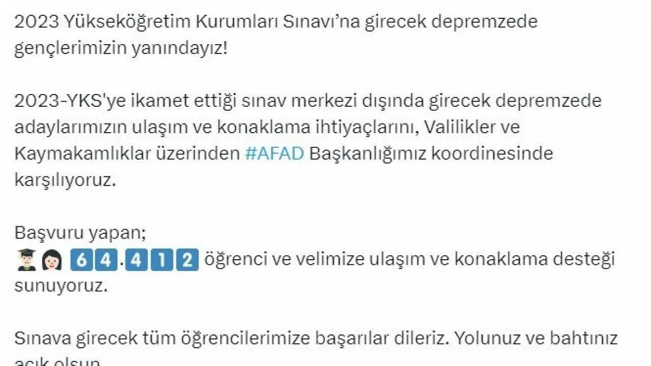 İçişleri Bakanı Ali Yerlikaya sosyal medya hesabından yaptığı paylaşımda, “2023 Yükseköğretim Kurumları Sınavı’na girecek depremzede gençlerimizin yanındayız. 2023-YKS’ye ikamet ettiği sınav merkezi dışında girecek depremzede adaylarımızın ulaşım ve konaklama ihtiyaçlarını, valilikler ve kaymakamlıklar üzerinden AFAD Başkanlığımız koordinesinde karşılıyoruz. Başvuru yapan 64 bin 412 öğrenci ve velimize ulaşım ve konaklama desteği sunuyoruz. Sınava girecek tüm öğrencilerimize başarılar dileriz. Yolunuz ve bahtınız açık olsun” ifadelerine yer verdi.
