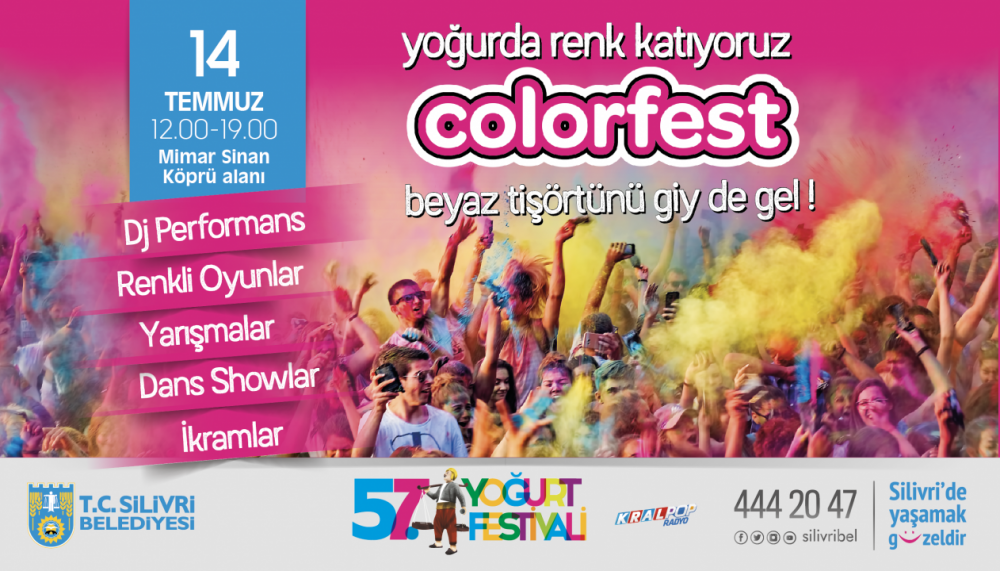 Birçok ülkede gerçekleştirilen ve boya festivali olarak bilinen ‘Color Fest’ etkinliği, Silivri Belediyesi 57. Yoğurt Festivali etkinlikleri kapsamında 14 Temmuz’da Silivri’de gerçekleşecek. ‘Yoğurda renk kat’ sloganıyla hayata geçecek festivalde, katılımcılar tamamı organik gıda boyalarını birbirlerinin üzerine atarak boya savaşı yapacak, canlı müzik eşliğinde eğlenecek. Color Fest, 57. Silivri Yoğurt Festivali’nin son günü Mimarsinan Köprüsü yanında 12.00’de başlayacak. DJ canlı performans müzik eşliğinde renkli oyunlar, yarışmalar, dans şovları gibi birçok etkinliğin ve ikramların yapılacağı Color Fest’in finalinde, binlerce kişi gökyüzüne fırlatacağı boyalarla gökkuşağı oluşturacak. DJ eşliğinde sürpriz sanatçıların yer alacağı Color Fest’te, davetliler müziğe, dansa ve eğlenceye doyacak. Farklı renklerde binlerce boya, Silivri Belediyesi tarafından katılımcılara dağıtılacak. Yaş sınırlaması olmayan etkinlik, 7’den 77’ye tüm Silivrililere açık ve ücretsiz.