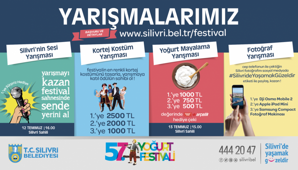 Üreticileri teşvik etmek ve Silivri’nin meşhur tadını yaşatmak adına yapılan Geleneksel Yoğurt Mayalama Yarışmasında katılımcılar en güzel Silivri Yoğurdu için yarışacak. Yarışmada birinciye 1000 TL’lik, ikinciye 750 TL’lik ve üçüncüye de 500 TL’lik Arçelik Hediye Çeki armağan edilecek. Festival sahnesinde gelenekselleşen Yoğurt Yeme Yarışması’nda, katılımcılar yoğurt kâsesinin içinde altını bulmak için yarışacak. Festivalin açılış kortejinde ise kostümler yarışacak. En renkli kostümü tasarlayan birinciye 2500 TL, ikinciye 2000, üçüncüyü de 1000 TL hediye edilecek. Festival kapsamında Dalgakıran Mevkiinde altın hediyeli Deniz Etkinlikleri ve Ödüllü Yarışmalar gerçekleştirilecek. En güzel sesin seçileceği Silivri’nin Sesi Yarışması’nda birinci olan kişi festival sahnesinde konser verecek. Sosyal medya üzerinden #Silivri’deYaşamakGüzeldir etiketiyle gerçekleşecek Fotoğraf Yarışması’nda Silivri’yi en iyi anlatan birinciye Dji Osmo Mobile 2, ikinciye Apple Ipad Mini ve üçüncüye Samsung Compact Fotoğraf Makinesi hediye edilecek.