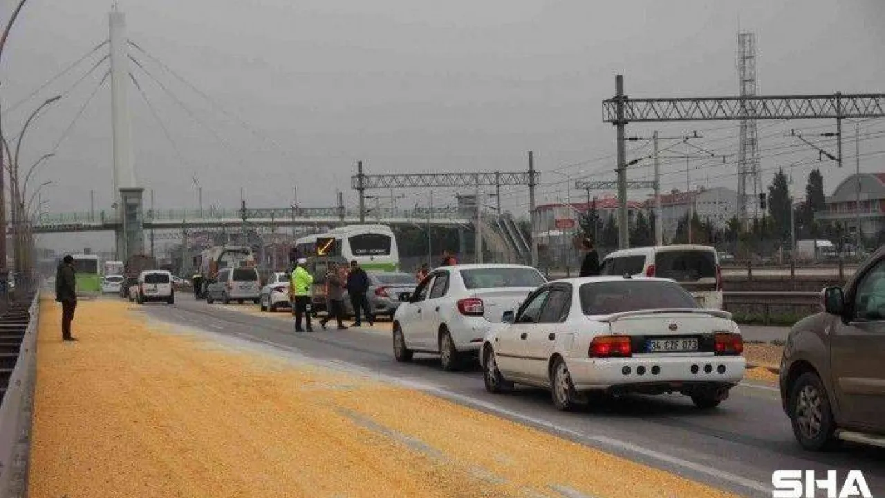 Kocaeli'nin İzmit ilçesinde seyir halindeki mısır yüklü kamyonun kapağı açılınca mısırlar yola döküldü.