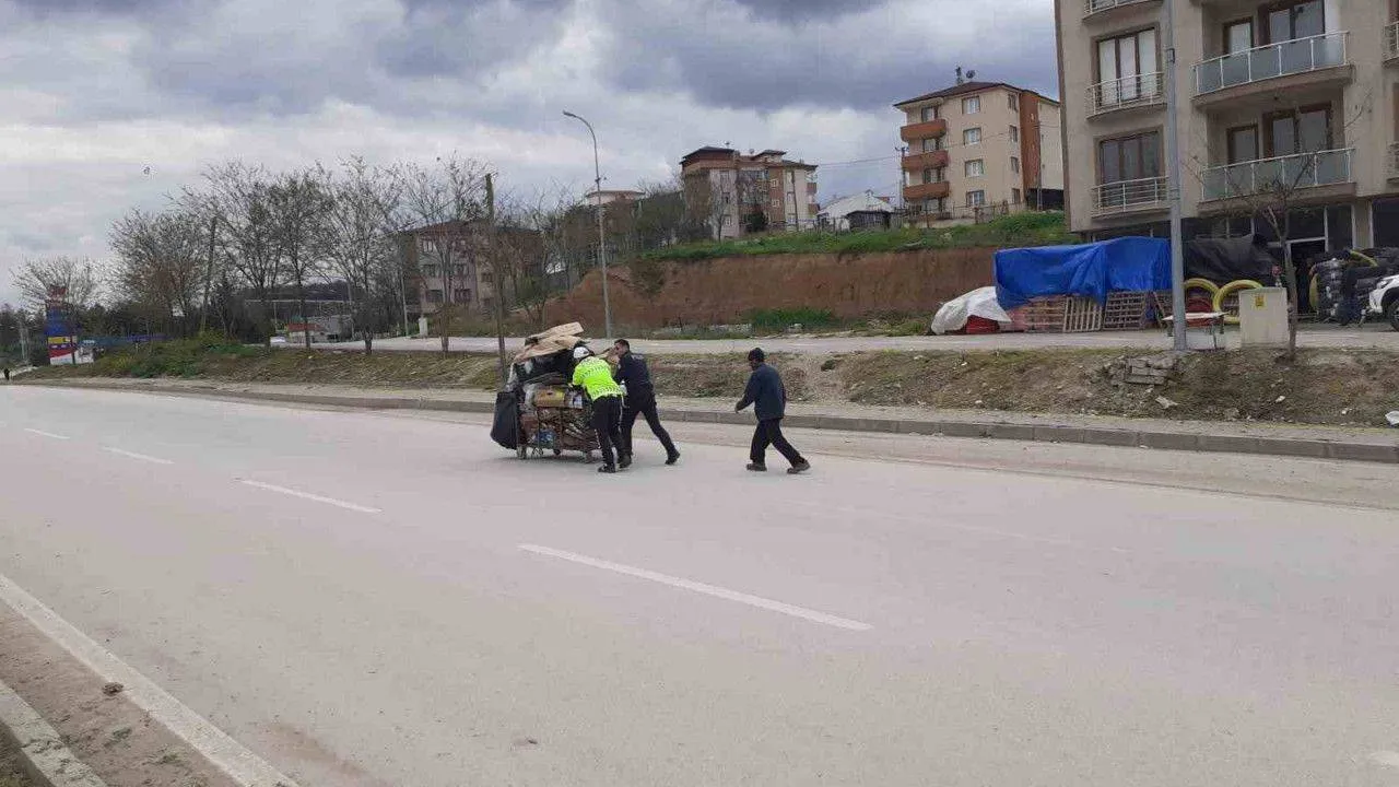Bilecik'in Osmaneli ilçesinde bayramda asayiş ve trafik uygulaması yapan polis ekipleri, kağıt toplayan yaşlı adamın arabasını çekmekte zorlandığını görünce yardımına koştu.