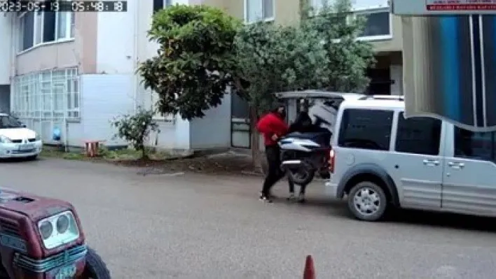 Bursa'da hafif ticari araçla seyir halindeki 3 hırsız yolda motosiklet görünce durup beş saniye düşündüler. Geri manevra yaparak gelen hırsızlar motosikleti bir dakikada kucaklayıp yükledikleri araçla ortadan kayboldu. O anlar güvenlik kamerasına saniye saniye yansıdı.