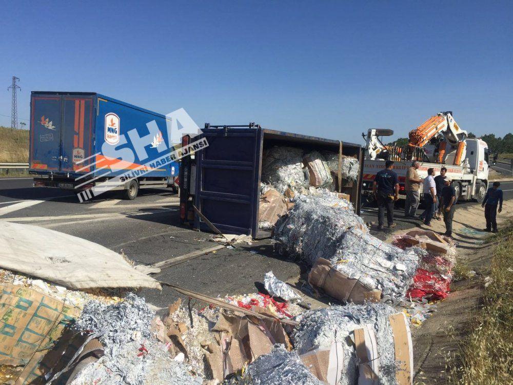 Çerkezköy'den İstanbul yönüne seyir eden geri dönüşüm kamyonu Değirmenköy kavşağında devrildi.