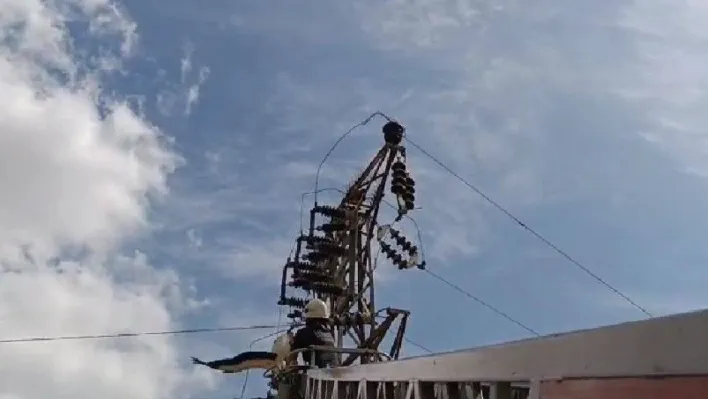 Yüksek gerilim hattında asılı kalan leyleği itfaiye kurtardı