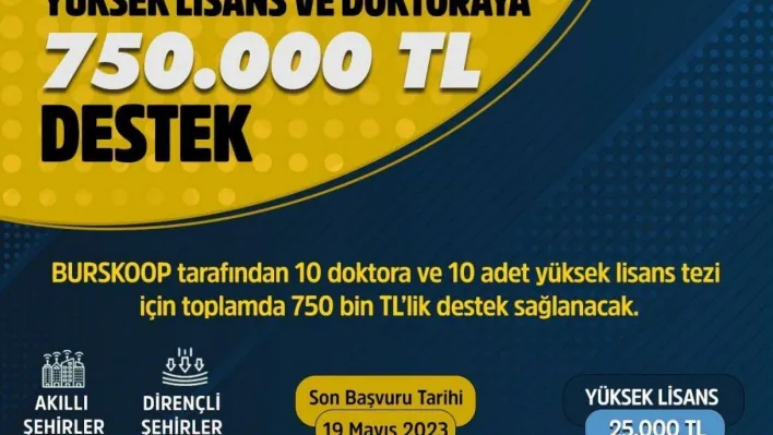 Eğitimin her kademesinde önemli yatırımları hayata geçiren Bursa Büyükşehir Belediyesi’nin üniversite ve meslek lisesi öğrencilerine yönelik burs uygulaması lisansüstü seviyeye taşındı. Türkiye’deki üniversitelerde Bursa ölçeğinde, ‘Akıllı Şehirler, Dirençli Şehirler ve Sürdürülebilir Şehirler’ olmak üzere 3 tema çerçevesinde yürütülecek olan araştırmalar için BURSKOOP’un lisansüstü tez desteğinden yararlanılabilecek. İlk kez verilecek Lisansüstü Tez Desteğinden ilgili alanlarda çalışma yürüten 10 doktora ve 10 yüksek lisans öğrencisi yararlanacak. Her bir doktora tezi için 50 bin TL, her bir yüksek lisans tezi için de 25 bin TL olarak belirlenen destekle toplamda 750 bin TL’lik destek sağlanmış olacak.