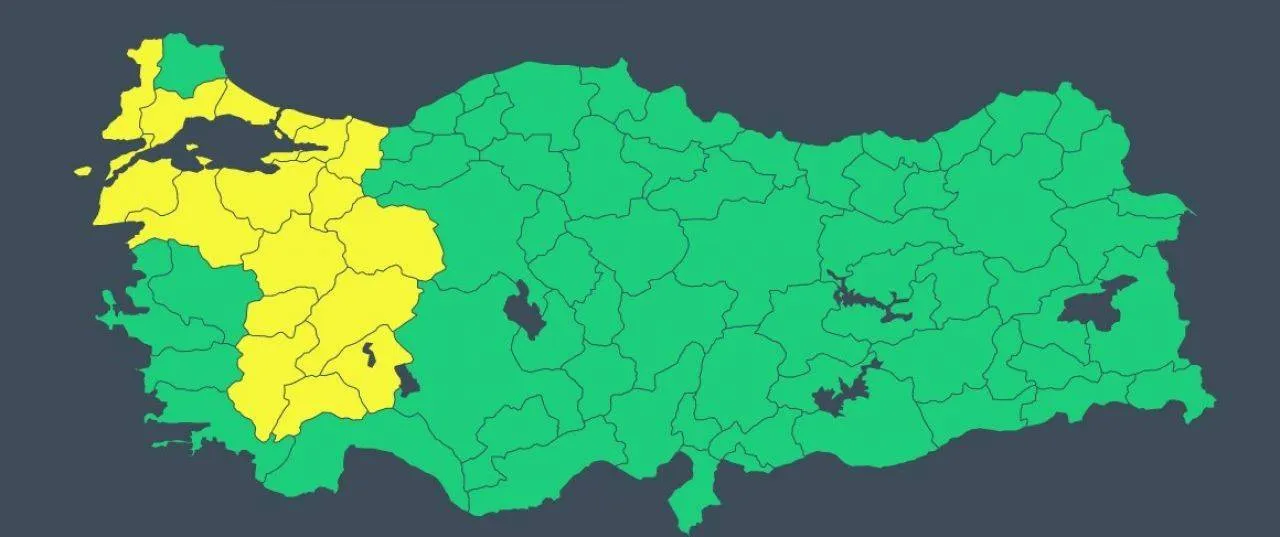 Sarı kodlu uyarı verilen iller ise Afyonkarahisar, Balıkesir, Bilecik, Burdur, Bursa, Çanakkale, Denizli, Edirne, Eskişehir, Isparta, İstanbul, Kocaeli, Kütahya, Sakarya, Tekirdağ, Uşak ve Yalova.