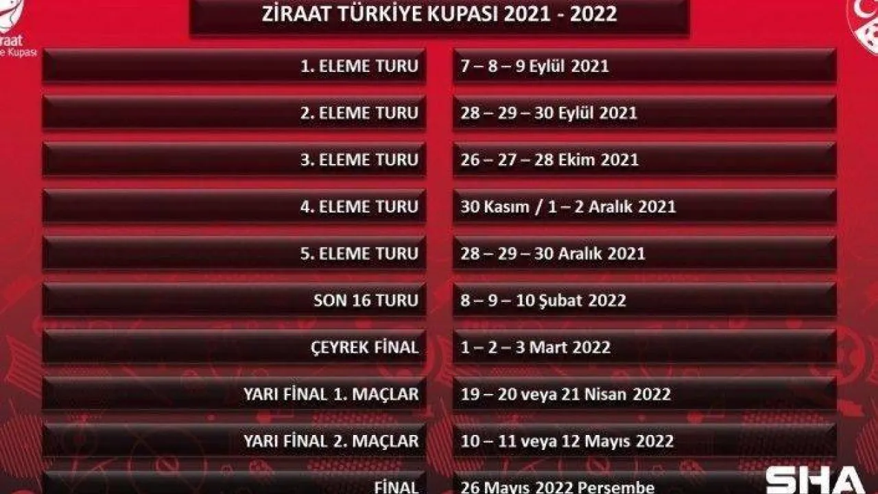 Türkiye Futbol Federasyonu’nun (TFF) resmi internet sitesinden yaptığı açıklamada, "2021 - 2022 sezonu Ziraat Türkiye Kupası maçlarının tarihleri açıklandı. Yapılan planlamaya göre Ziraat Türkiye Kupası’nda mücadele 7, 8 ve 9 Eylül’de oynanacak 1. Eleme Turu maçları ile başlayacak. Yarı finaller hariç tek maç eleme usulüne göre oynanacak Ziraat Türkiye Kupası’nda 26 Mayıs 2022’de yapılacak final müsabakasının yeri ve stadyumu daha sonra ilan edilecek" denildi.